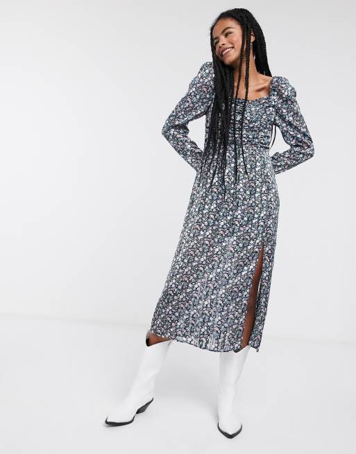 Other Stories Puff Sleeve Midi Dress In Blue Floral Print Asos