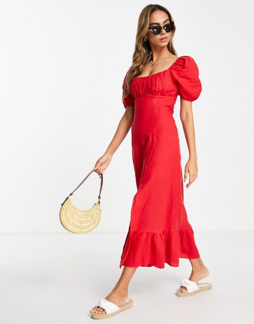 Other Stories Linen Puff Sleeve Midi Dress In Red Asos